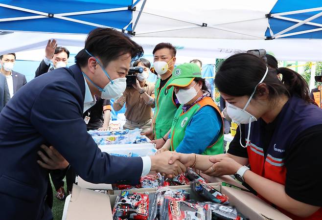 | ▲ 개혁신당 이준석 대선후보가 19일 오후 광주 광산구 금호타이어 광주공장 화재 현장에서 자원봉사자들을 격려하고 있다. 2025.5.19 |