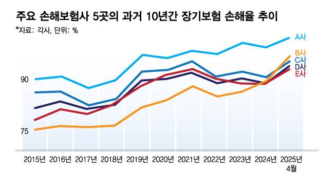 하지만 5개사가 공시한 장기보험의 예상 손해율(2024년 말 기준)은 제각각이었다.