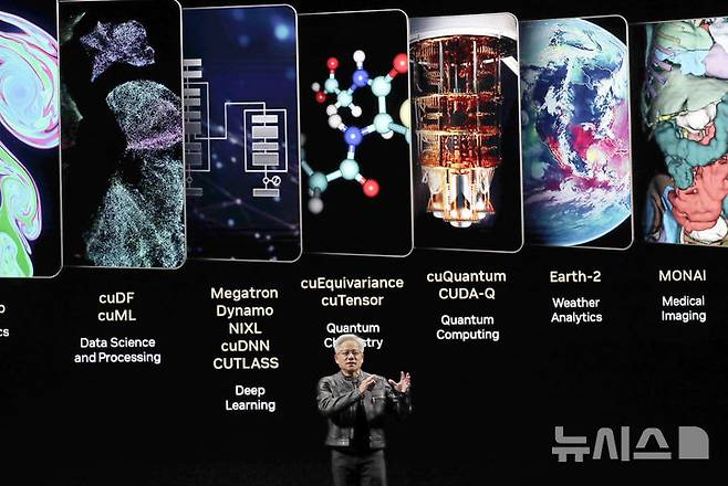 [타이베이=AP/뉴시스] 젠슨 황 엔비디아 최고경영자(CEO)가 19일(현지 시간) 대만 타이베이 뮤직센터에서 ‘컴퓨텍스 2025’ 개막을 앞두고 기조연설을 하고 있다. 그는 “대만은 인공지능(AI)과 로보틱스가 탄생하고 퍼져나갈 진원지”라고 말했다. ‘컴퓨텍스 2025’는 20일 개막한다. 2025.05.19.