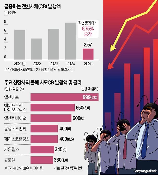 기업의 CB 발행액은 매년 증가하는 추세다. 올 들어 이달 16일까지 국내 기업의 CB 발행 규모는 총 2조5775억원으로 집계됐다. 작년 동기 대비 6.75% 늘어난 수치다. 연간으로 보면 2022년 4조8547억원에서 2023년 7조397억원, 2024년 8조4449억원으로 늘었다.