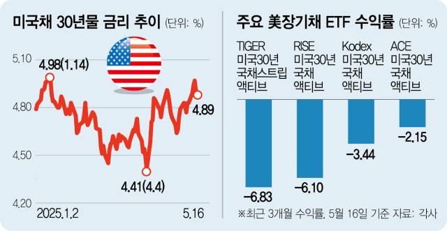기준금리 하락을 전망하며 미국 장기채에 베팅했던 서학개미(해외 증시에 투자하는 개인투자자)들의 수익률 반등 시점이 또 다시 뒤로 밀리게 됐다. 서학개미들은 지난달 초 도널드 트럼프 미국 대통령이 국가별 상호관세를 확정 발표해 미국채 금리가 튀어오를 때도 저점 매수 전략을 폈지만 무디스의 미국 신용등급 강등으로 국채값 하방 압력이 높아진 탓이다.