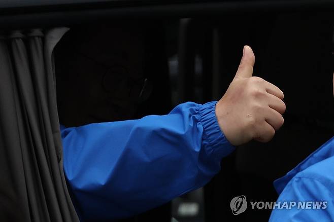 차창 밖으로 엄지손가락 내미는 이재명 후보