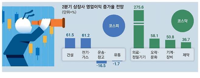 코스닥에서 오락·문화(58.09%)도 2분기 영업이익 전망이 밝은 대표적인 섹터로 꼽힌다. JYP Ent.(338.25%)를 비롯해 에스엠(55.80%) CJ ENM(21.92%) 등 투자자 관심이 큰 엔터주들이 대부분 좋은 실적을 낼 것으로 예측됐다.