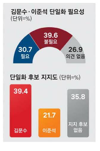매일경제·MBN 의뢰로 넥스트리서치가 실시해 19일 발표한 대선 여론조사에 따르면 김 후보와 이준석 후보의 단일화가 '필요하지 않다'는 응답이 39.6%로 가장 많았다.