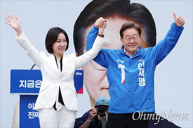 | ▲ 허은아 전 대표도 이재명 후보 지지 선언 이재명 더불어민주당 대선 후보가 19일 서울 영등포구 타임스퀘어 광장에서 열린 선거유세에서 이준석 개혁신당 대선 후보와의 갈등 끝에 탈당해 이재명 후보의 지지를 선언한 허은아 전 개혁신당 대표와 손을 맞잡고 있다. |