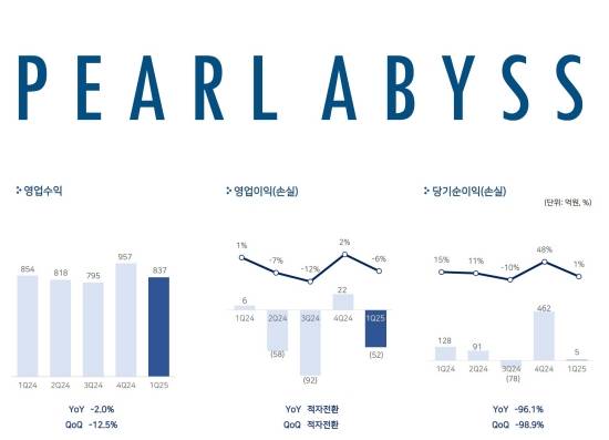 최근 펄어비스(대표 허진영)는 2025년 연결 기준 1분기 매출 837억 원, 영업손실 52억 원, 당기순이익 5억 원을 기록했다고 밝혔다.