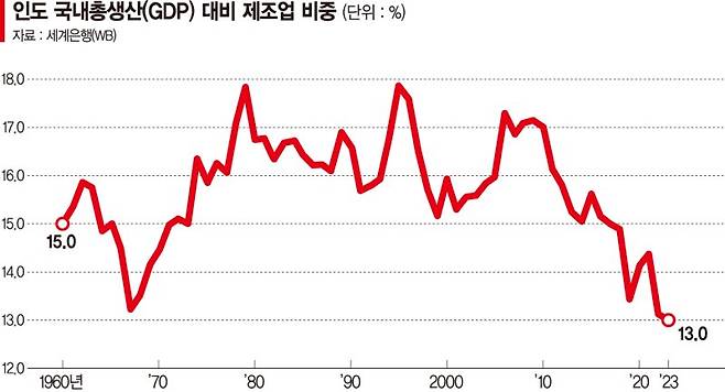 BBC는 인도의 열악한 제조업 환경을 언급하며 인도 국내총생산(GDP) 가운데 제조업 비중이 20년 동안 15% 안팎에 머물고 있다고 분석했다.