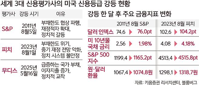 반면 2023년 8월 피치가 미국 신용등급을 강등했을 때 파장은 2011년에 비해 제한적이었다. 미 국채금리와 달러화가 동반 상승했다. 2023년 8월은 미 기준금리가 5.5%로 최고 수준에 이르면서 10년물 미 국채금리도 4%를 상회하는 등 미국 신용등급 하향조정보다는 ‘금리발작’ 시그널과 그에 따른 ‘킹 달러’ 우려가 확산되던 국면이었다.