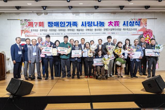 부산국제장애인협의회(회장 강충걸)가 주최한 제7회 장애인가족 사랑나눔 대상 시상식(대회장 정종원 (주)건양산업 회장)이 지난 15일 부산 부산진구 양정동 국제식품 연회장에서 열렸다. 이날 시상식에서 장애와 어려움 속에서도 가족 사랑의 꽃을 피우고 행복을 나눈 10명의 수상자에게 대상증서와 상금 각 300만 원이 전달됐다.