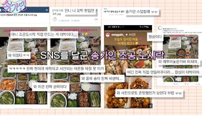 19일 송가인 유튜브 채널에선 ‘조공도시락이 한식뷔페?! SNS 난리난 역대급 송가인 조공도시락 최초공개 숟가락만 들고 오쇼잉 | 가인로그여라’라는 제목의 영상이 업로드됐다.