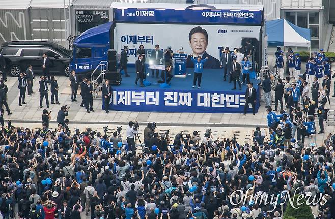 | ▲ 이재명 더불어민주당 대선후보가 19일 오후 서울 영등포구 타임스퀘어 광장에서 열린 유세에서 시민들에게 지지를 호소하고 있다. |