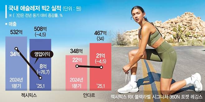 애슬레저 업계 '빅2'인 젝시믹스와 안다르 모두 올 1·4분기 소비침체 속에 원가상승과 고환율 등의 여파로 수익성이 역성장하자 사업 다각화를 통해 불황에 대비하는 분위기다.