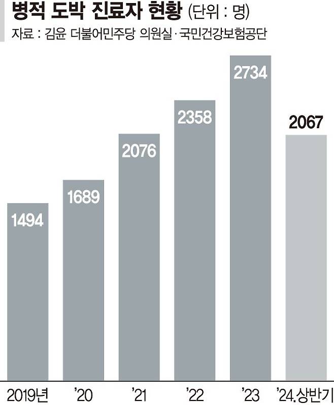 진료 인원은 2021년 처음으로 2000명을 넘어선 뒤 2023년 2700명을 돌파했다. 지난해에는 상반기에만 2000명이 넘는 인원이 진료를 받았다. 경찰에 적발된 후 상담 의뢰를 받은 인원도 급증했다. 2023년 180명에서 2024년 2086명으로 1058.9% 폭증했다.