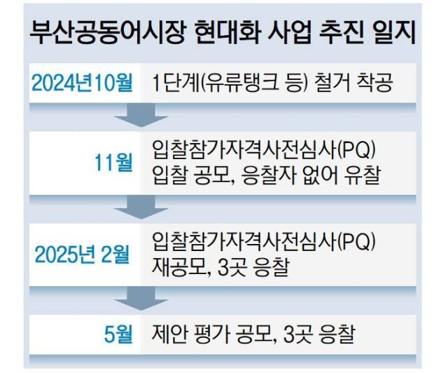 19일 부산시에 따르면 지난 13일 부산공동어시장 현대화 사업 공모 입찰이 마감됐으며, HJ중공업, 대보건설, 한얼ENC 등 3개 건설사가 참여해 입찰 참가자 자격 등록, 설계안 등을 제출했다. 시는 지난해 11월 본 공사 시공사 선정을 위한 입찰참가자격사전심사(PQ) 공모를 진행했지만, 공사 기간이 1187일(약 39개월)로 짧다는 평가가 나오면서 단 한 곳도 응찰하지 않았다. 이후 지난 2월 입찰자가 최대 50%(593일)까지 추가 연장을 제안할 수 있도록 조건을 완화했고, 3곳이 응찰했다.