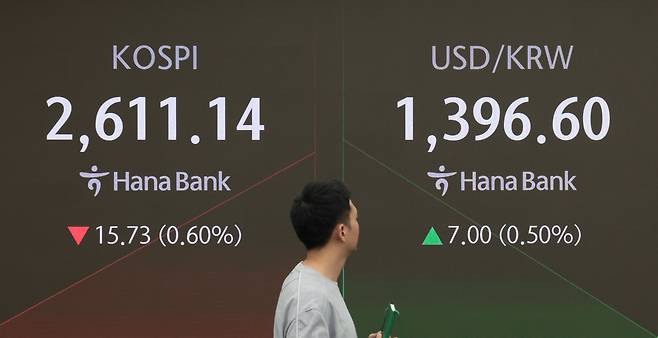 | ▲ 19일 서울 중구 하나은행 본점 딜링룸 현황판에 코스피 지수 등이 표시되고 있다. 이날 코스피 지수는 전 거래일 대비 13.17포인트(0.50%) 내린 2613.70에, 코스닥은 3.80포인트(0.52%) 내린 721.27에 개장했다. |