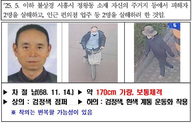 경찰 등에 따르면 차씨는 19일 오전 9시 32분께 경기도 시흥시 정왕동의 한 편의점에서 60대 여성 점주 B씨를 찌르고 달아났다. 이어 4시간여 만인 오후 1시 30분께 한 편의점 인근에서 70대 남성 C씨를 찌른 것으로 알려졌다.