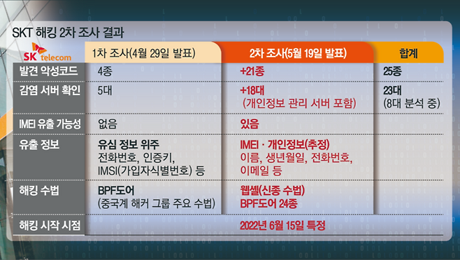 ▷지난 4월 말 조사단 1차 발표 이후 공격을 받은 정황이 있는 서버 18대가 추가로 발견됐다. 현재까지 총 23대의 서버가 감염된 것으로 확인됐다. 이 중 단말기고유식별번호와 이름, 생년월일, 전화번호, 이메일 등 다수의 개인정보가 임시 저장·관리되는 서버 2대에서 추가 감염된 사실이 발견됐다. 다만 악성코드가 추가 확인된 해당 서버에서 정보 유출이 이뤄졌는지는 확인이 불가하다. 따라서 현재 명확하게 유출됐다고 볼 수 있는 정보는 가입자 전화번호, 가입자식별번호(IMSI) 등 유심 복제에 활용될 수 있는 정보 등이다. 다만 추후 개인정보보호위원회 조사 결과에서 유출 범주에 대한 명확한 내용이 나올 전망이다.