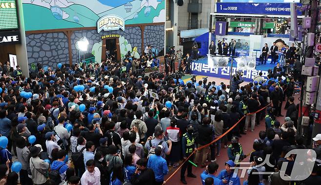 (서울=뉴스1) 안은나 기자 = 이재명 더불어민주당 대통령 후보가 19일 오후 유세를 위해 서울 마포구 홍대 레드로드를 찾아 유권자들을 향해 지지를 호소하고 있다. 2025.5.19/뉴스1