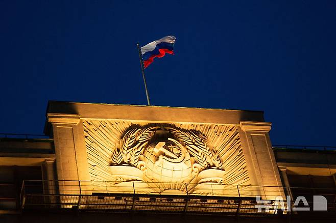 [모스크바=AP/뉴시스]낫과 망치가 부조된 러시아 모스크바의 국가두마(하원) 지붕에 2019년 3월3일 러시아 국기가 펄럭이고 있다. 러시아 당국은 19일 인권단체 국제사면위원회를 "바람직하지 않은 조직"으로 불법화했다. 러시아는 2015년 제정한 법에 따라 바람직하지 않은 조직에 연루되는 것을 형사 범죄로 규정하고 있다. 2025.05.19.