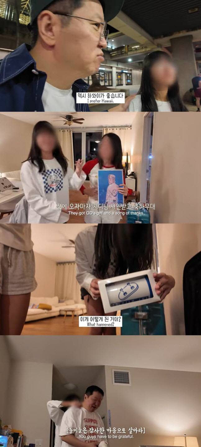 정형돈은 집으로 가자마자 아이들을 대신해 지드래곤에게 받은 사인을 공개했다. 두 딸은 사인 선물에 춤까지 추며 기뻐했다. 이어 정형돈의 캐리어 속 투어스 사인 앨범을 보고 다시 깜짝 놀랐다. 두 딸은 "어떻게 된 거야?"라며 감격했고 정형돈을 안아주고 안마까지 해줬다. 정형돈은 "아빠를 안아주고 마사지까지 해준다"라며 흡족한 미소를 지었다.