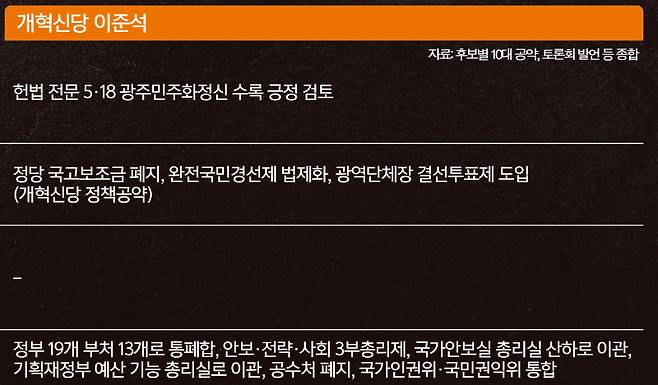 개혁신당 이준석 후보는 정부 효율성을 강조하는 방안을 제1호 공약으로 내세웠다. 그는 ‘대통령 힘 빼고 일 잘하는 정부 만든다’는 주제로 19개 정부 부처를 13개 부처로 통폐합한다는 공약을 제시했다.