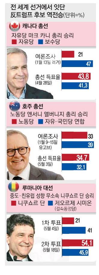 지난달 28일 치러진 캐나다 총선에서는 마크 카니 캐나다 총리가 이끄는 집권 자유당이 ‘캐나다의 트럼프’로 불리던 보수당의 피에르 폴리에브 대표를 상대로 승리하며 집권 연장에 성공했다. 지난 3일 치러진 호주 총선에서는 중도 좌파 성향의 집권 노동당을 이끄는 앤서니 앨버니지 호주 총리가 트럼프 따라 하기를 전략으로 내세운 보수 성향의 피터 더턴 자유당 대표가 이끄는 야권 연합(자유당·국민당)을 누르고 연임에 성공했다.
