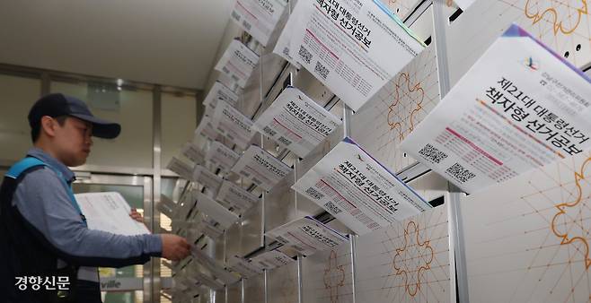 제21대 대통령 선거일을 보름 앞둔 19일 우정사업본부 집배원이 서울 강남구의 한 오피스텔 우편함에 책자형 선거공보물을 넣고 있다.