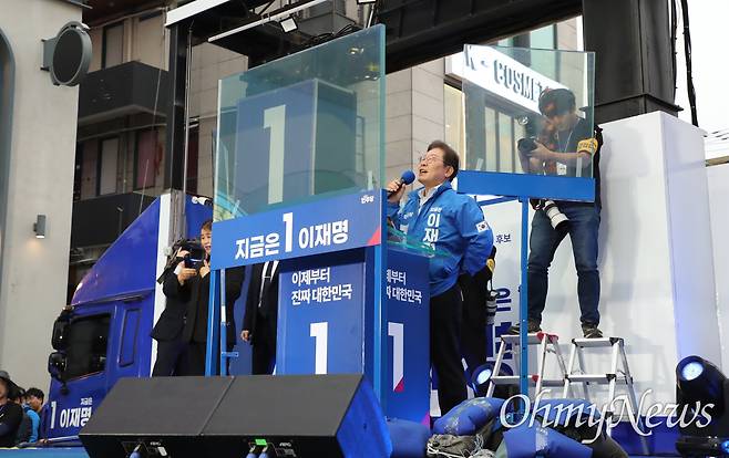 | ▲ 이재명 더불어민주당 대선 후보가 19일 오후 서울 마포구 KT&G 상상마당 앞에서 방탄유리가 설치된 유세차에 올라 연설하고 있다. |