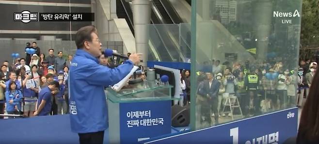 이재명 용산역 유세 현장에 ‘방탄유리’ 등장…대선 후보 최초