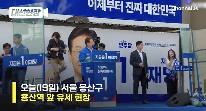 이날 이 후보의 서울 용산역 유세 현장에는 저격 위협을 차단하기 위한 이동식 방탄 유리막이 설치됐다. 이 후보가 연단에 올랐을 때 양쪽에서 막아주는 형태로, 다른 유세 현장에도 설치될 예정이다.