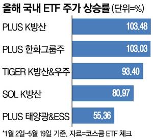 2023년 1월 러시아·우크라이나 전쟁 전에 상장한 PLUS K방산은 설정 이후 수익률이 300%를 훌쩍 넘었다. PLUS 한화그룹주 역시 지난해 12월 말 상장한 이후 반년도 채 되지 않아 두 배의 성과를 냈다.