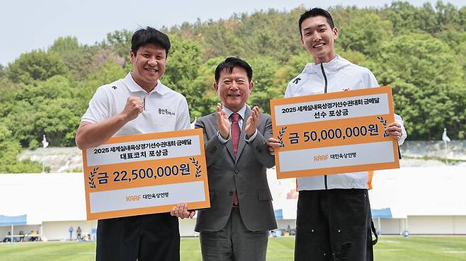 ▲ 우상혁(오른쪽)이 19일 밀양종합경기장에서 대한육상연맹으로부터 2025 세계실내선수권 우승 포상금 5천만 원을 받고, 기념 촬영하고 있다. 왼쪽은 김도균 대표팀 코치, 가운데는 육현표 대한육상연맹 회장.
