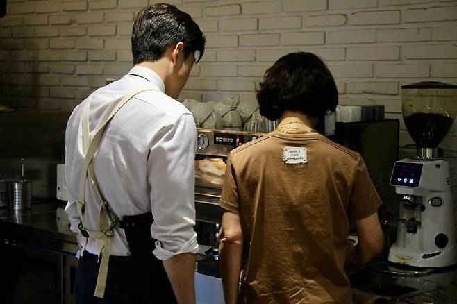 [서울=뉴시스] 조성봉 기자= 김용태 국민의힘 비상대책위원장이 19일 오후 서울 서초구 한 카페에서 커피를 내리며 카페 사장과 대화를 하고 있다. (사진=김용태 의원 페이스북)2025.05.19. photo@newsis.com