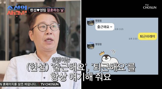 결혼식 당일, 먼저 메이크업을 끝낸 심현섭은 "처음엔 나도 귀찮았는데 (영림이한테)서울에서 일 보러 나간다고 하면 무슨 옷 입었는지 사진을 찍어 보내라고 한다. 일생을 간섭 안 받고 살았는데 갑자기 이러니까 처음에는 약간 스트레스 받았다"고 말했다. 이어 그는 "이제 '나를 생각해 주는구나' 이해가 된다. 코 털 깎기도 갖고 다닌다. 자기가 내 코털을 신경 써야 되겠다고 하더라"며 54년 평생 처음 받는 밀착 케어에 행복한 미소를 지었다. 그러면서 심현섭은 "영림이는 '출근한다', '퇴근한다'를 항상 이야기 해준다. 1년 동안 똑같이 매일"이라고 덧붙였다.