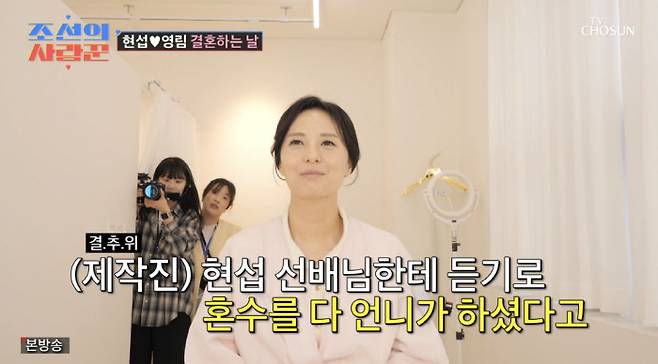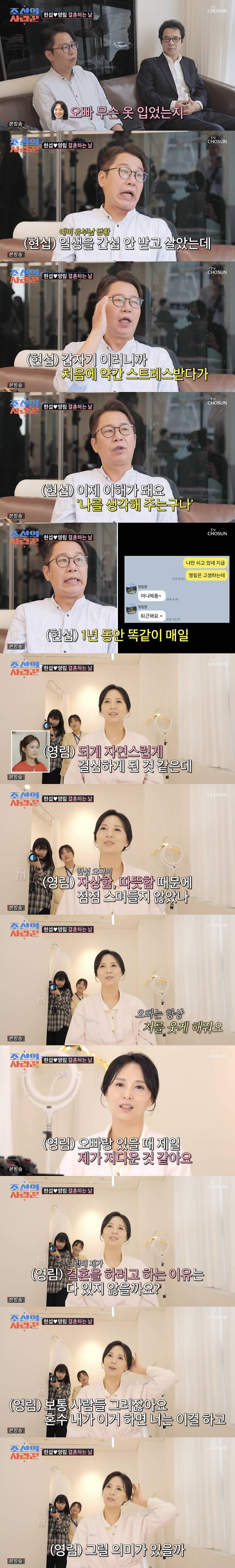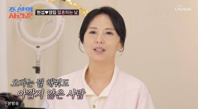특히 혼수를 다 정영림이 했다고. 이에 정영림은 "예전에도 그랬고 앞으로도 그렇겠지만 오빠한테 계산적이고 싶지 않다. 그냥 다 해주고 싶다. 오빠는 뭘 해줘도 아깝지 않은 사람이다"라면서 "보통 사람들은 '혼수 내가 이거 하면 너는 이걸 하고'라고 하지 않나. 그럴 의미가 있을까"라며 심현섭을 향한 애정을 드러냈다.