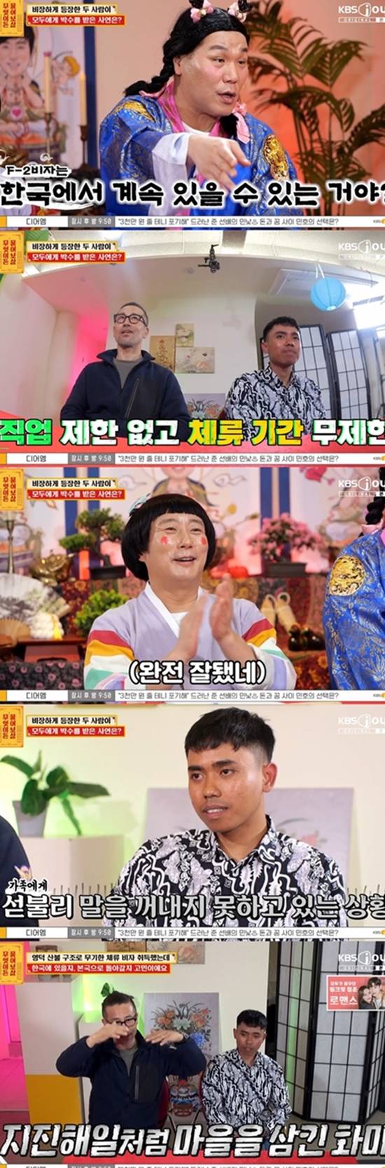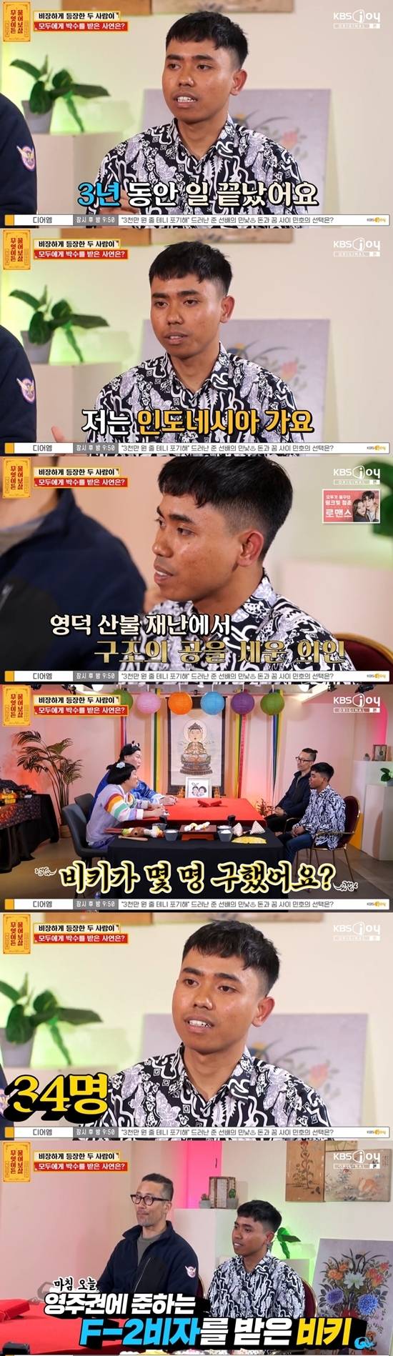 의인은 "3년 동안 한국에서 일했다. 이제 곧 인도네시아에 간다"며 고민을 털어놨다. 의인은 영덕 산불 재난에서 공을 세웠다. 의인이 "34명을 구했다"고 말하자 이수근과 서장훈이 박수를 보내며 "이 정도면 영주권 줘야 하는 거 아니야?"라고 말했다.