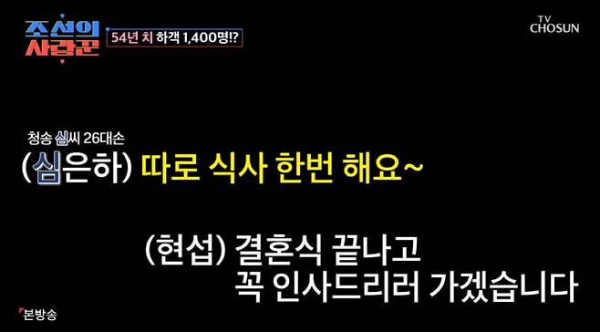 19일 방송된 TV CHOSUN '조선의 사랑꾼'에서는 무려 1,400명의 하객들이 내방한 '54세 초혼' 심현섭의 역대급 정신 없는 결혼식이 공개됐다.