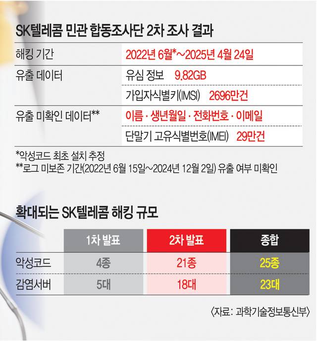 19일 과학기술정보통신부의 SK텔레콤 침해 사고 민관합동조사단 2차 조사 결과 발표에 따르면 이날 기준 총 23대의 서버가 악성코드에 감염된 것으로 확인됐다. 악성코드 종류는 25종으로 파악됐다. 지난달 29일 1차 조사 결과 발표 당시(서버 5대, 악성코드 4종)와 비교하면 피해 범위가 크게 늘어났다.