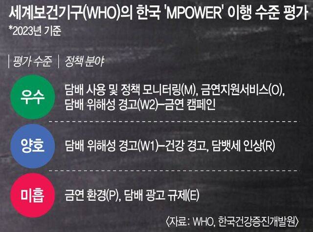 이 같은 한국의 금연 캠페인 추진은 WHO로부터 지난 10년간 꾸준히 높은 평가를 받는 동력이 됐다. WHO는 2008년부터 2년마다 발간하는 세계흡연실태 보고서를 통해 194개 회원국의 주요 담배규제 정책 이행 수준을 평가하고 있다. 가장 최근의 평가 보고는 2023년이었다. 오는 7월쯤 이후 상황을 반영한 새 보고서가 공개될 예정이다.