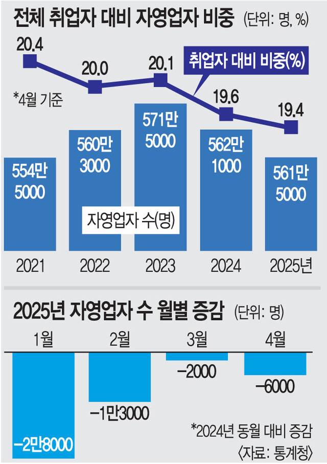 자영업자 수도 감소세다. 통계청에 따르면 지난달 자영업자는 561만5000명으로 전년 동월대비 6000명 줄었다. 올해 초부터 자영업자 수 감소세는 두드러지고 있다. 1월 2만8000명, 2월 1만3000명, 3월 2000명이 줄며 넉 달 연속 내리막이다. 통계청 관계자는 “자영업자 수는 2022년부터 증가세를 보이다 지난해엔 등락을 반복했다”며 “전체 취업자는 늘어도 자영업자 비중은 꾸준히 낮아지는 추세”라고 설명했다. 전체 취업자 대비 자영업자 비율은 2021년 20.4%에서 올해 19.4%로 감소했다.