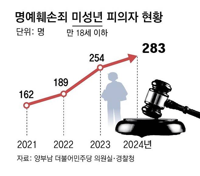 최근 10대 학생 사이에서 친구에 대한 뒷담화, 불만 등을 형사 고소로 해결하려는 사례가 늘고 있다. 19일 동아일보가 국회 행정안전위원회 소속 양부남 더불어민주당 의원실을 통해 경찰청으로부터 확보한 ‘명예훼손죄 피의자 현황’에 따르면 최근 4년간 명예훼손죄 피의자 중 만 18세 이하 미성년자는 2021년 162명, 2022년 189명, 2023년 254명, 지난해 283명으로 꾸준히 늘고 있다. 이들 888명 중 절반이 넘는 449명은 불송치로 사건이 종결됐다. 이 중 상당수는 미성년자가 미성년자를 고소한 사건이다. 경찰 관계자는 “미성년자 명예훼손죄 고소 사건은 단순 주관적 의견 표현이 담긴 대화 내용이나 사소한 말다툼으로 접수되는 경우가 많아 불송치 비율이 높다”고 설명했다.