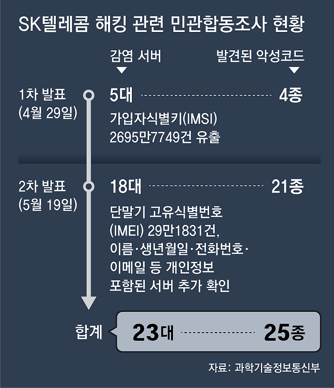 과학기술정보통신부는 19일 이 같은 내용의 2차 조사 결과를 내놨다. 1차 조사에서 악성코드 감염이 확인된 서버는 5대로 이 가운데 홈가입자서버(HSS) 3대에서 25종의 정보 유출이 확인됐다. 2차 조사에서 감염 서버 18대가 추가 발견됐다. 유출된 유심 정보는 2695만7749건에 달해 사실상 전체 가입자의 정보가 유출된 것으로 확인됐다. SK텔레콤과 알뜰폰 이용자를 합친 고객은 2500만 명이다.