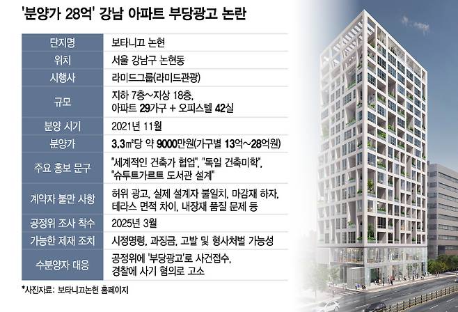 공정거래위원회가 강남구 논현동 신축 하이엔드 아파트 '보타니끄 논현'의 부당광고 관련 사건을 접수하고 조사에 착수한 것으로 확인됐다. 이 단지는 골프장, 호텔 등 레저사업을 영위하는 라미드그룹(라미드관광)이 시행에 나선 고급 아파트로 분양 초기부터 유명 건축가의 참여를 강조했지만 실입주자들 사이에선 "홍보와는 전혀 다른 결과물"이라는 불만이 쏟아진다.