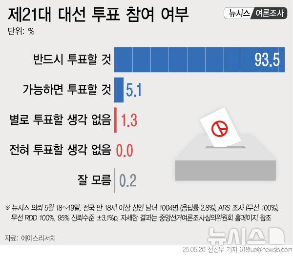 뉴시스가 여론조사 회사 에이스리서치에 의뢰해 지난 18~19일 만 18세 이상 남녀 1004명을 대상으로 실시한 여론조사에서 대선에 투표할 의향이 있는지 묻는 질문에 '반드시 투표할 것'이라고 밝힌 응답자는 93.5%인 것으로 조사됐다.