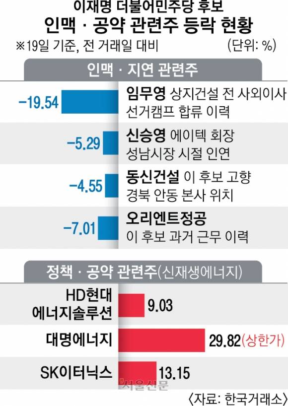 대선 후보들과의 지연·인연 등을 앞세워 급등한 ‘인맥 테마주’의 상승 동력이 대선 레이스 본격화와 함께 ‘정책·공약 테마주’로 옮겨 가고 있다. 21대 대통령 선거 후보자 1차 토론회에서 더불어민주당 이재명 후보가 신재생에너지를 강조하면서 관련주들이 불을 뿜은 반면 인맥 테마주들은 줄줄이 급락했다.