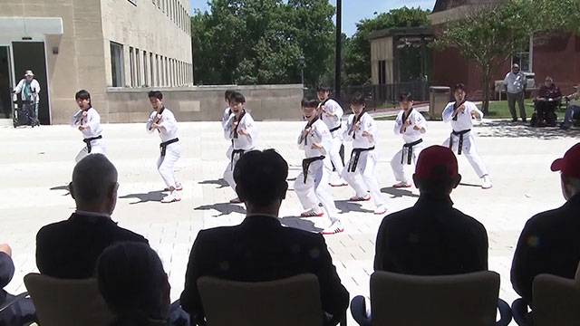 한국전쟁 참전용사 등 전역 미군들과 미국 현지 태권도 지부, 재향군인회 관계자들이 참석한 가운데, 국기원 시범단은 공중 돌려차기와 발차기 등 고난도 태권도 동작을 선보였습니다.