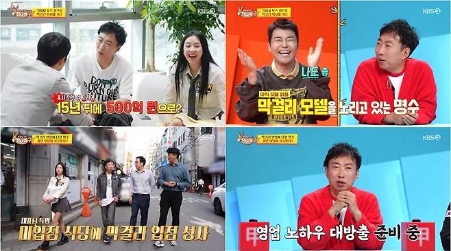 박명수는 "여기 인심이 푸짐하네요"라며 식당 칭찬 릴레이로 식당주인의 마음을 봉인해제 시키더니 "생선구이에 어울리는 막걸리가 있는데 시음 한 번 해보시겠어요?"라며 자연스레 시음을 권유하며 절반의 영업을 성공했다.