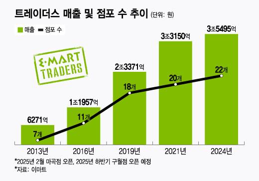 2010년 첫 매장을 연 트레이더스는 점포 수를 지속적으로 늘리며 매출 규모를 키워왔다. 2013년 6271억원이었던 매출은 2016년 1조1957억원, 2019년 2조3371억원, 2021년 3조3150억원, 2024년 3조5495억원으로 11년만에 5.7배 가량 늘어났다. 국내 창고형 할인점 시장 점유율 1위인 미국계 코스코트의 연매출은 6조5301억원(2024 회계연도 기준)이다. 국내 유통사 중에거 코스트코의 독주를 견제할 수 있는 건 트레이더스가 유일한 셈이다.