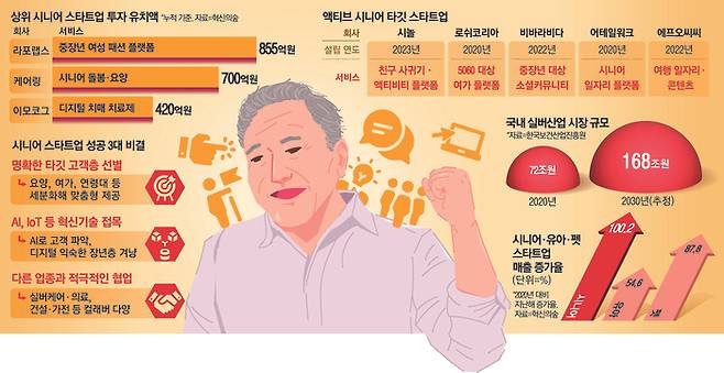 시니어산업에는 유아·펫 산업보다 많은 첨단기술이 적용되면서 시장 성장 가능성이 더 크다는 게 벤처투자(VC) 업계 분석이다. 한국보건산업진흥원에 따르면 국내 실버산업 규모는 2020년 72조원에서 2030년 168조원으로 커질 전망이다.