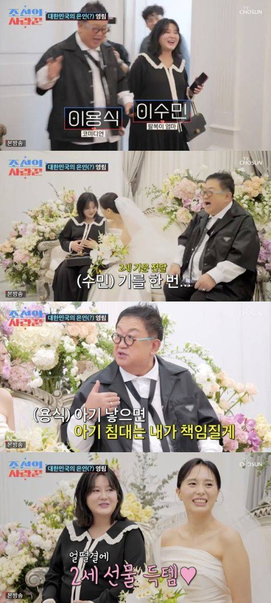 이용식과 이수민도 신부대기실을 찾았다. 결혼식 당시 임신 중이던 이수민은 “기를 한 번”이라며 2세의 기운을 전달했다. 이용식은 “아기 낳으면 침대, 카시트까지 책임지겠다”라고 축하의 말을 건넸다.